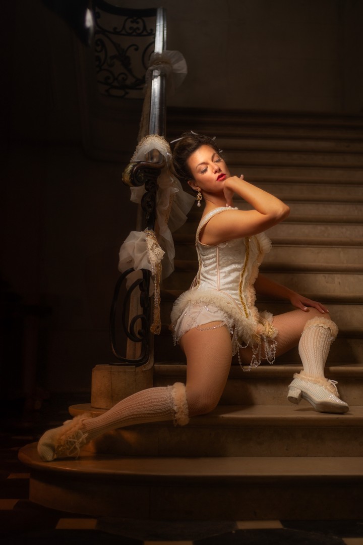 Fiona RoseLicht als een veer, precies als een metronoom. Fiona Rose is een burlesque performer die gratie en spelplezier moeiteloos samenbrengt. Als klassiek geschoolde danser vond Fiona haar hart opnieuw in de wereld van het burlesque. Waar het podium vroeger strak afgelijnd was door traditie en discipline, omarmt ze nu de vrijheid van verleiding, het plezier van het onverwachte en de kunst van zelfexpressie. Met haar techniek als fundament en haar flair als kroonjuweel danst ze alsof ze de tijd even stilzet. Fiona is de gedroomde stage kitten - een verborgen diamant in het burlesque-universum. Met een oog voor detail en een theatrale elegantie ruimt zij de attributen van het podium alsof ze deel uitmaakt van de show zelf. Geen veer, handschoen of glanslint blijft liggen zonder haar magische tussenkomst. Ze doet meer dan opruimen: ze weeft stilte tussen de scènes tot een verhaal op zich. Binnen de burlesque groep Les Muses du Temps is Fiona Rose een wervelende jonge kracht die haar energie en toewijding schenkt aan de grootse visie van haar Zonnekoningin. In haar rol als dansende muze brengt ze een ode aan de pracht en praal van het hofleven anno 1620. In elke sierlijke pas, elke fonkelende blik, herleeft het publiek de decadentie van een koninklijk bal - met een hedendaagse knipoog. Fiona Rose is niet alleen de toekomst van burlesque - ze is de brug tussen traditie en rebellie, tussen techniek en pure overgave. Laat je meevoeren, en dans even met haar mee - al is het maar in je verbeelding. |