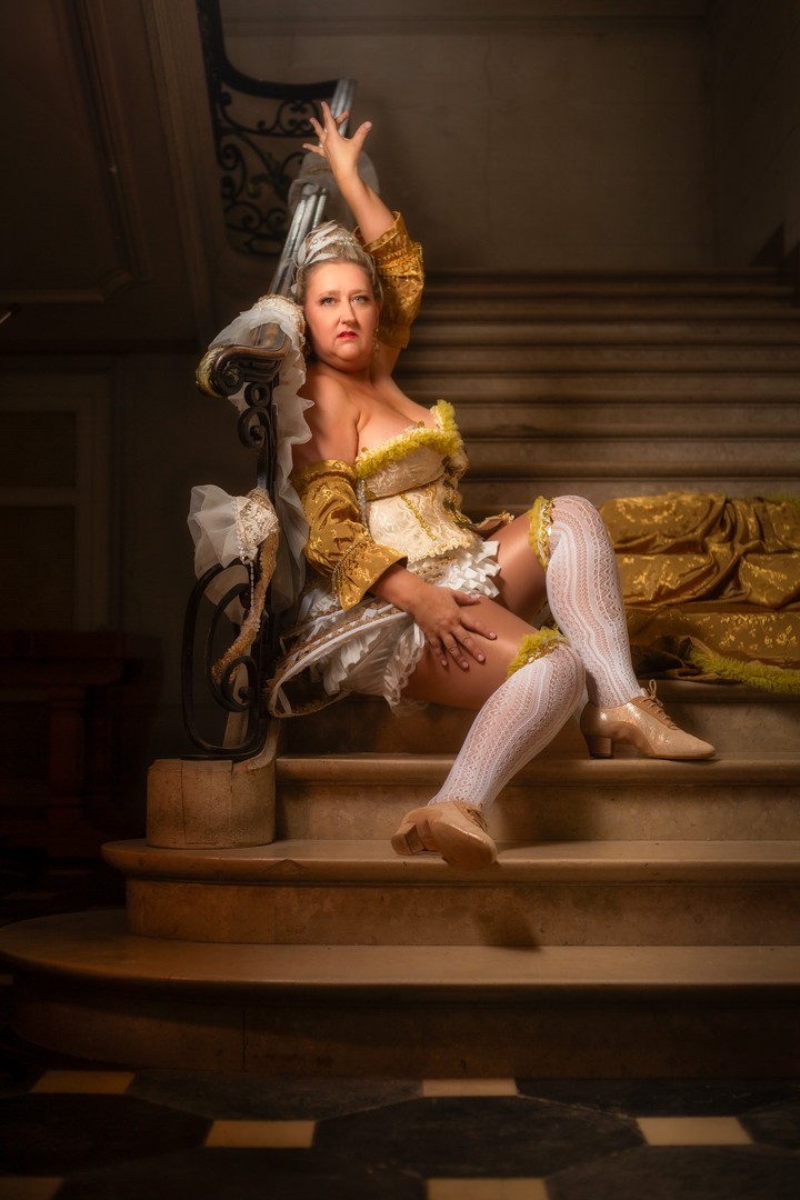 Fiona RoseLicht als een veer, precies als een metronoom. Fiona Rose is een burlesque performer die gratie en spelplezier moeiteloos samenbrengt. Als klassiek geschoolde danser vond Fiona haar hart opnieuw in de wereld van het burlesque. Waar het podium vroeger strak afgelijnd was door traditie en discipline, omarmt ze nu de vrijheid van verleiding, het plezier van het onverwachte en de kunst van zelfexpressie. Met haar techniek als fundament en haar flair als kroonjuweel danst ze alsof ze de tijd even stilzet. Fiona is de gedroomde stage kitten - een verborgen diamant in het burlesque-universum. Met een oog voor detail en een theatrale elegantie ruimt zij de attributen van het podium alsof ze deel uitmaakt van de show zelf. Geen veer, handschoen of glanslint blijft liggen zonder haar magische tussenkomst. Ze doet meer dan opruimen: ze weeft stilte tussen de scènes tot een verhaal op zich. Binnen de burlesque groep Les Muses du Temps is Fiona Rose een wervelende jonge kracht die haar energie en toewijding schenkt aan de grootse visie van haar Zonnekoningin. In haar rol als dansende muze brengt ze een ode aan de pracht en praal van het hofleven anno 1620. In elke sierlijke pas, elke fonkelende blik, herleeft het publiek de decadentie van een koninklijk bal - met een hedendaagse knipoog. Fiona Rose is niet alleen de toekomst van burlesque - ze is de brug tussen traditie en rebellie, tussen techniek en pure overgave. Laat je meevoeren, en dans even met haar mee - al is het maar in je verbeelding. |